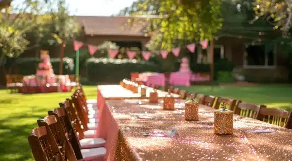 Tables also come in various shapes and designs. A brief chat with your local party rental company will help narrow down your choices. Factors like the planned party space and arrangement can also influence your table shape or design.